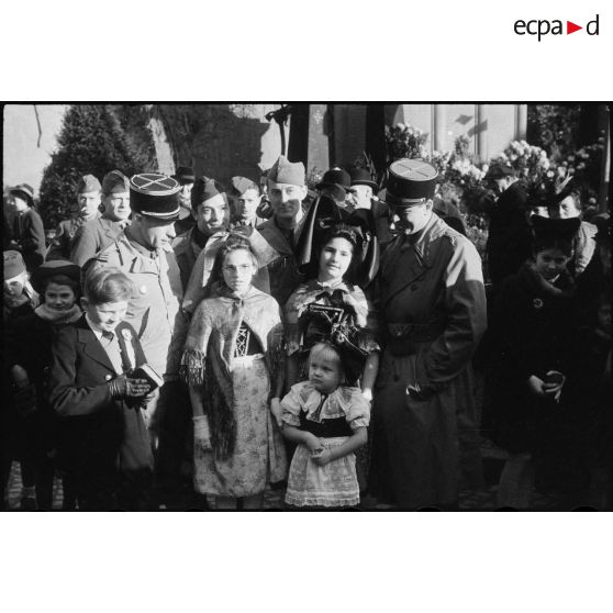 Le 10 décembre 1944, le général Leclerc assiste à l'office religieux du Te Deum à Erstein, où est installé son PC. La population est venue nombreuse saluer les hommes de la 2e DB et célébrer la libération de la commune. Des femmes et des enfants revêtus du costume traditionnel alsacien fraternisent avec les soldats. Certains se réunissent autour du journaliste Pierre Bourdan correspondant de guerre auprès de la division Leclerc en 1944 (1).