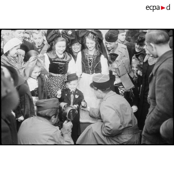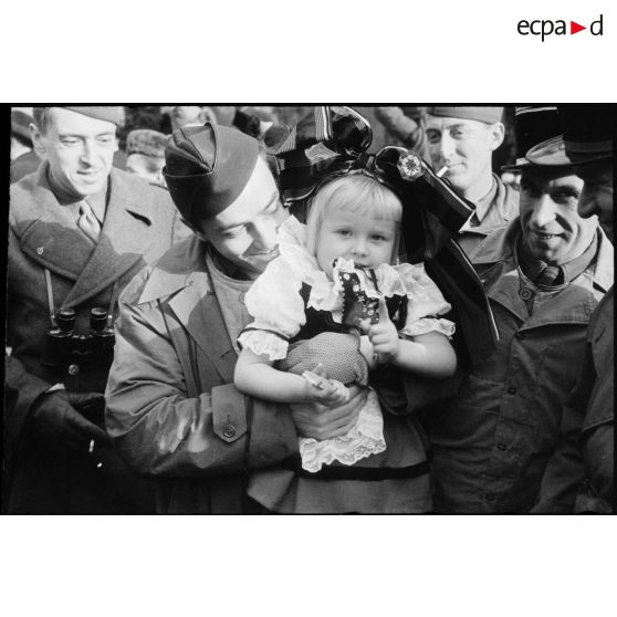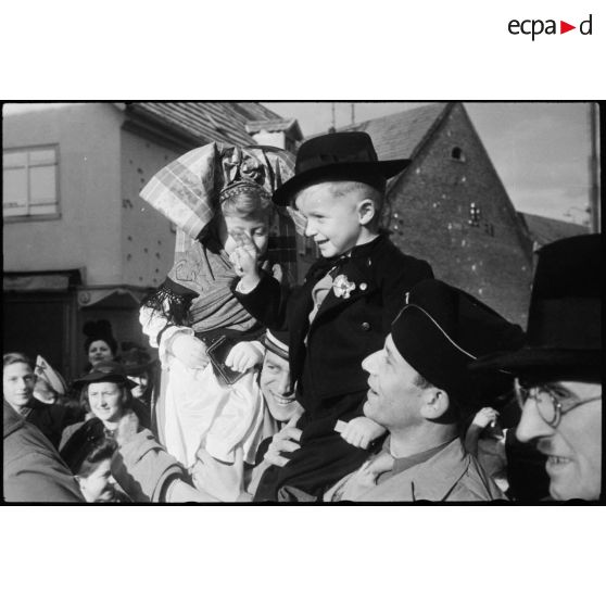 Pierre Bourdan porte une enfant revêtue du costume traditionnel alsacien dans la commune de Erstein (Bas-Rhin) libérée.