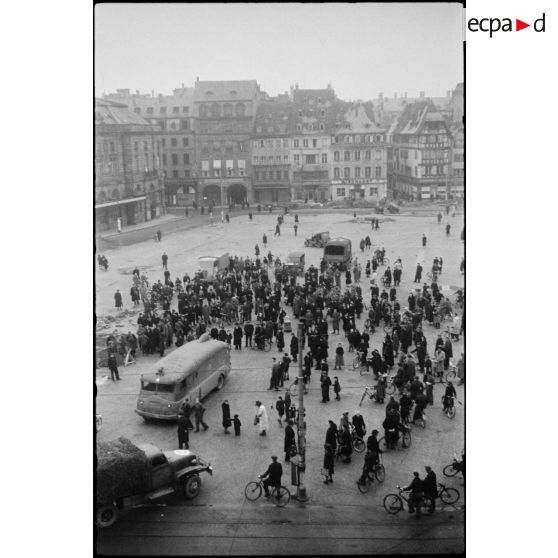 Foule rassemblée place Kléber à Strasbourg (Bas-Rhin) pour écouter les nouvelles diffusées depuis un haut-parleur.