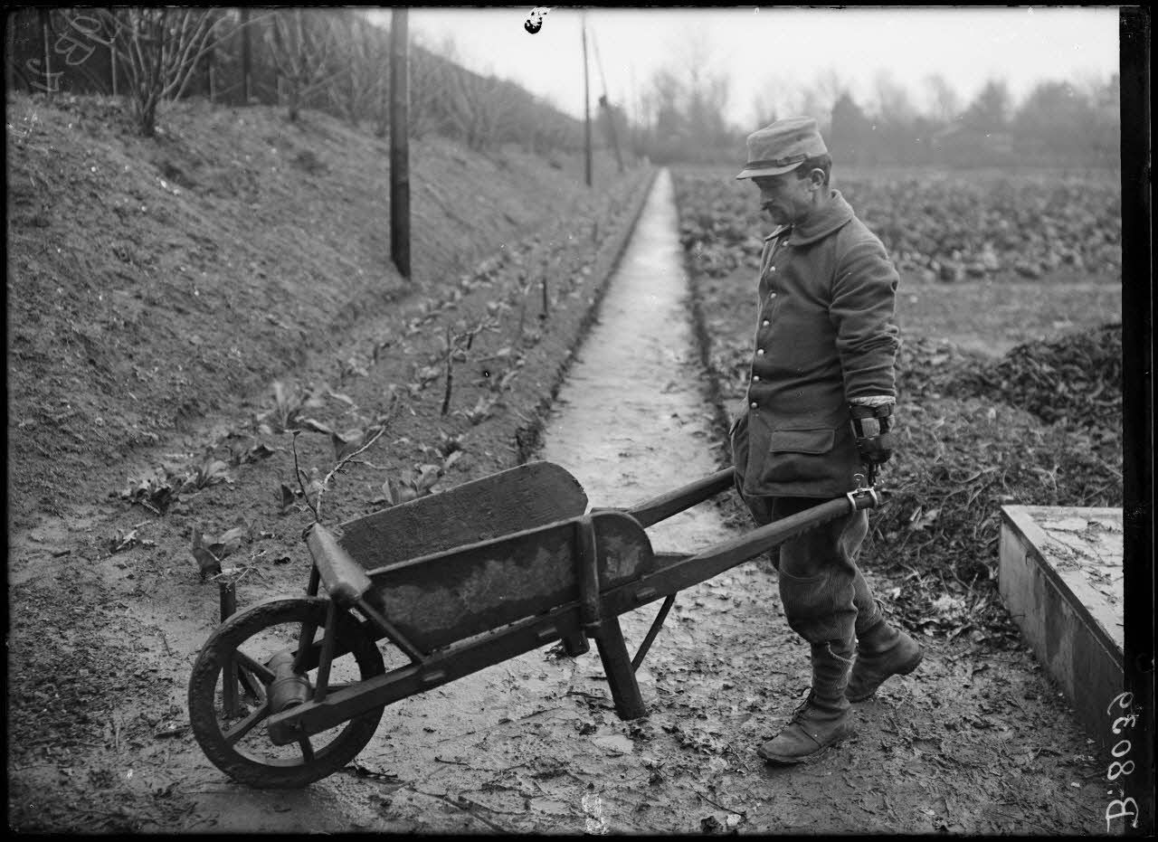 Maison-Blanche (Seine). Rééducation des mutilés cultivateurs. Cultivateur conduisant une brouette grâce au porte-outil Devanne. [légende d'origine]