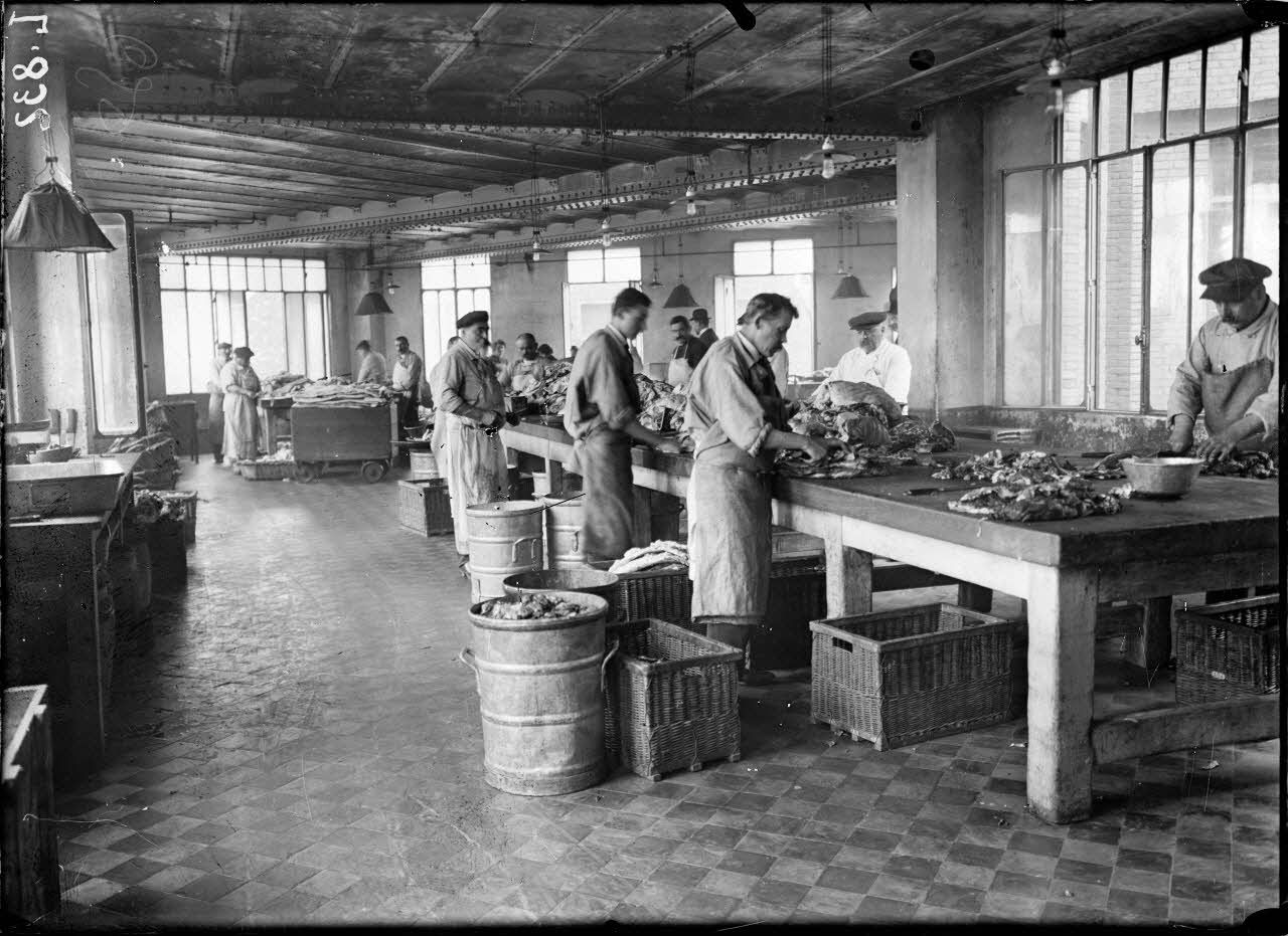 Maison Felix Potin. Usine de La Villette. Préparation de la charcuterie. Le dépeçage.