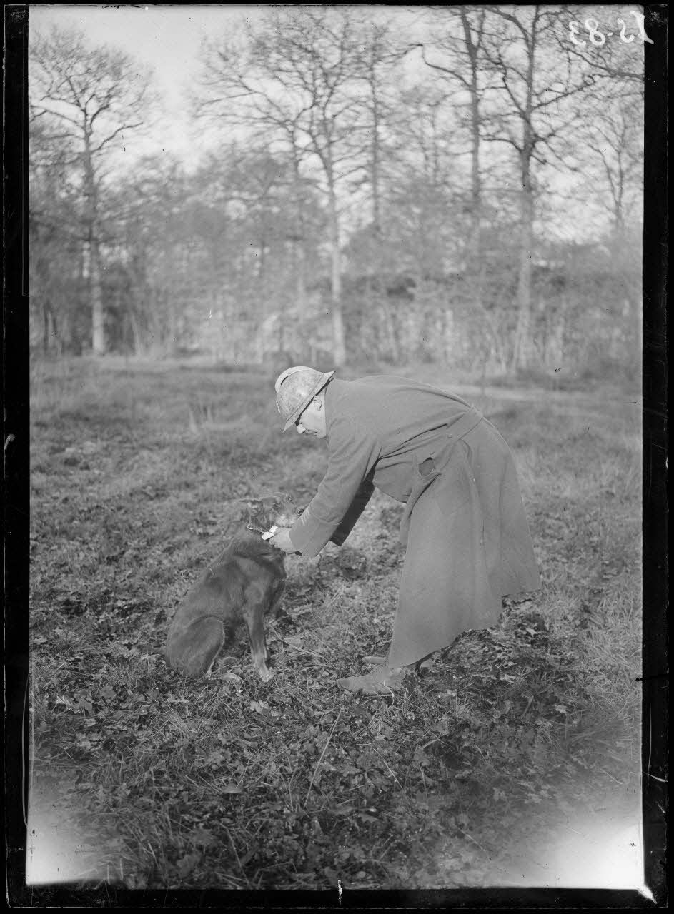 Maison-Lafitte, la société nationale du chien sanitaire et de guerre. M. Lepel Boutet, président fondateur de la société des chiens sanitaires et de guerre, avec le chien champion "Rolph".