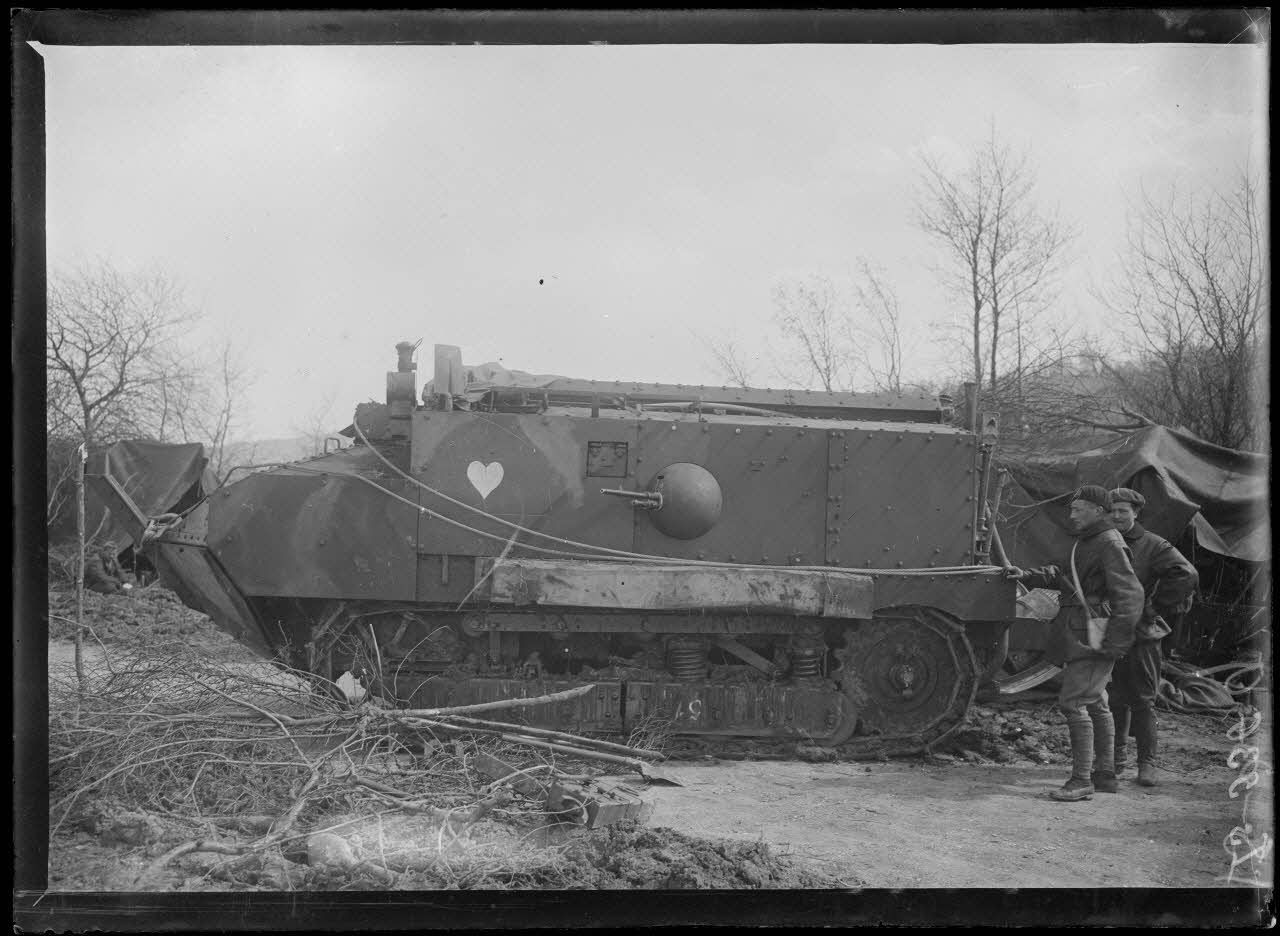 - Près de Maizy (IS 533 à IS 538), retour d'un tracteur Caterpillar. Le char M1 AsCo2 n° 61157 du S/Lt Jean Bescond de retour des lignes allemandes après l'échec de l'attaque sur le village de Guignicourt. L'équipage du char Schneider pose au retour de la mission.