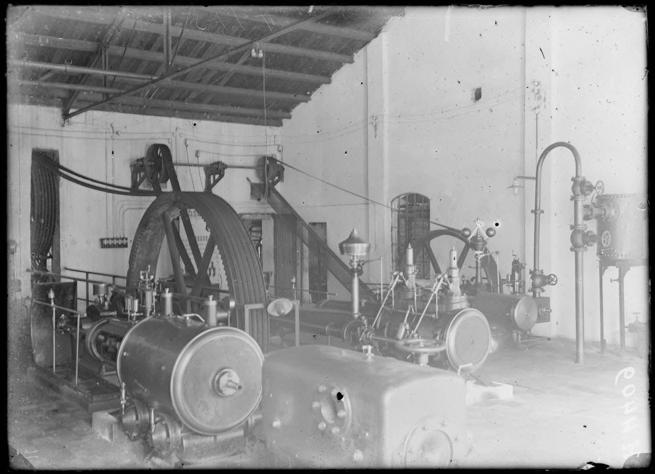 A Maka, dans une huilerie, vue de la salle des moteurs : des machines à vapeur dont l'une est équipée d'un régulateur à boules.