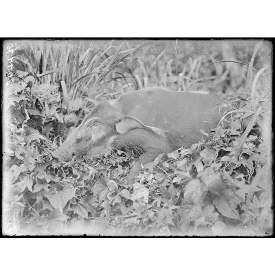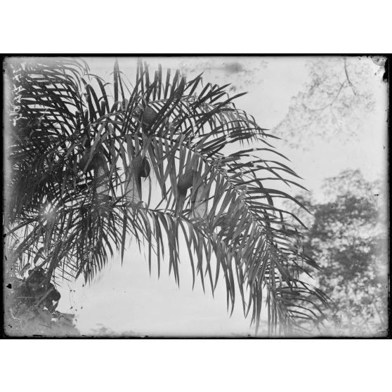 - Dans le village de Kaké, des oiseaux sauvages ont fait leurs nids dans les palmes où erre également un phacochère. Un chasseur de panthères de la race Abo s'apprête à partir.