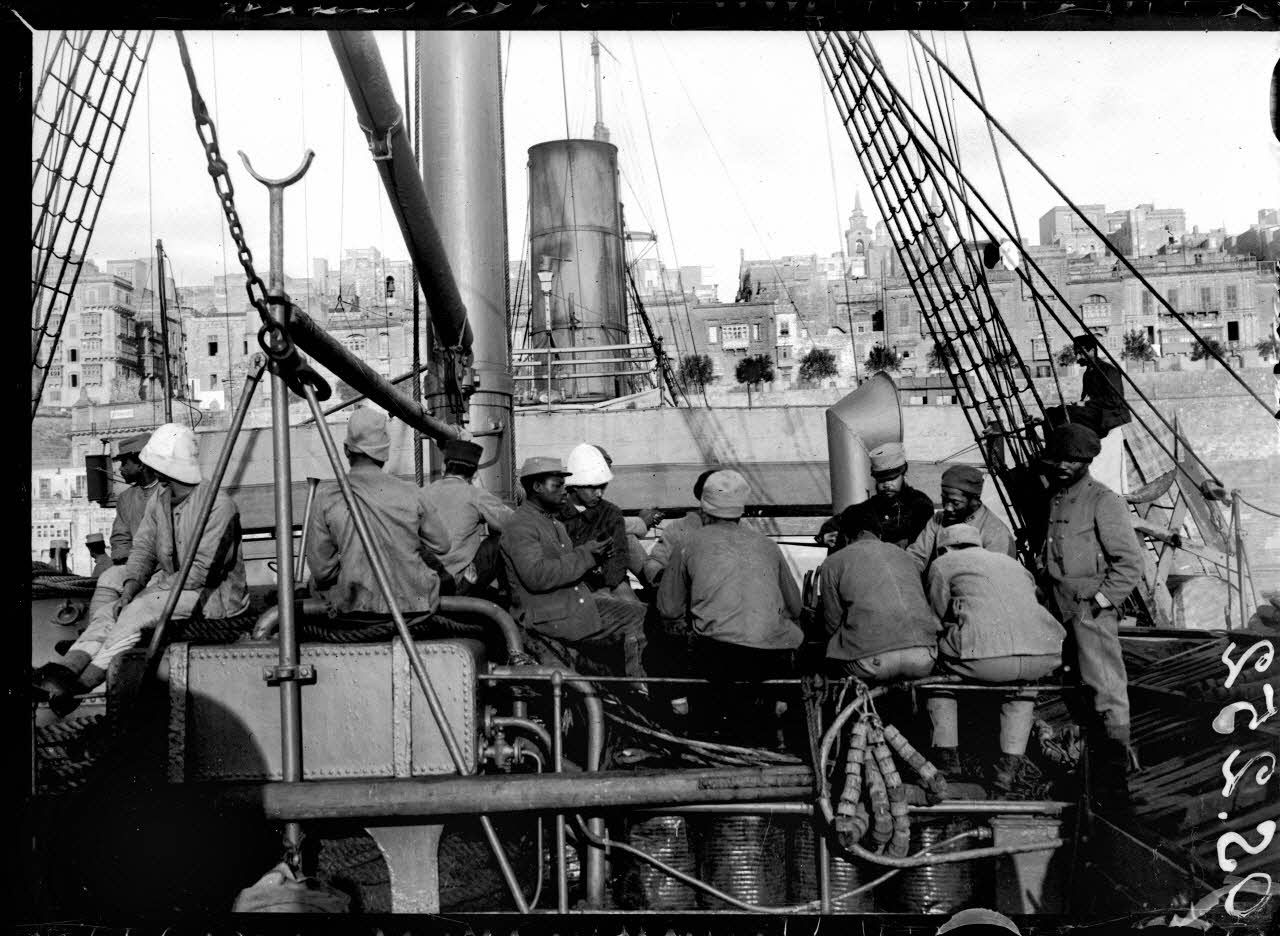 Des tirailleurs malgaches, à bord de "l'Océanien", rejoignent Port-Saïd en faisant escale à Malte.
