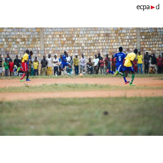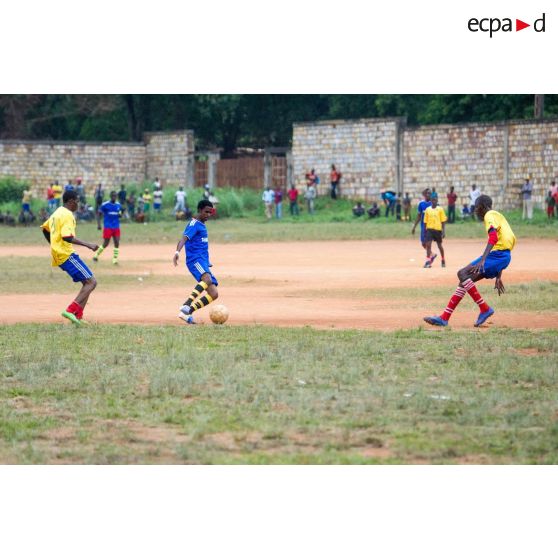 Joueurs disputant un match de football au cours d'une manifestation sportive pour la paix au stade de Bambari, lors de la journée internationale de la jeunesse.