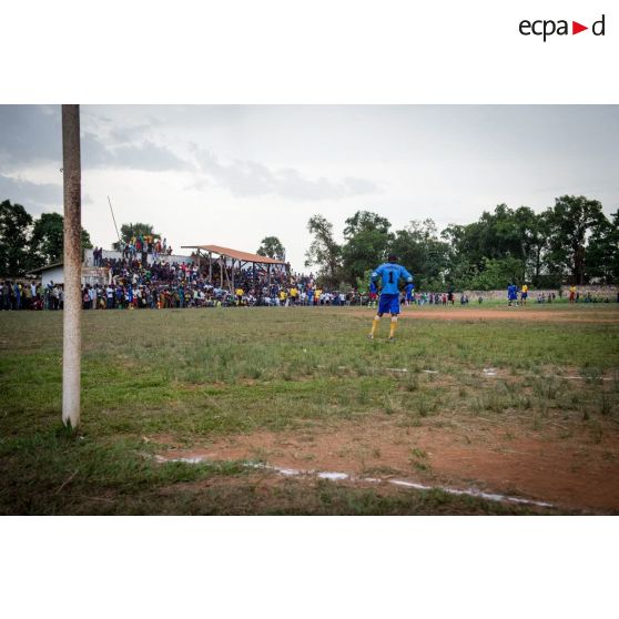 Joueurs de football se reposant en mi-temps sous le regard du public au cours d'une manifestation sportive pour la paix au stade de Bambari, lors de la journée internationale de la jeunesse.