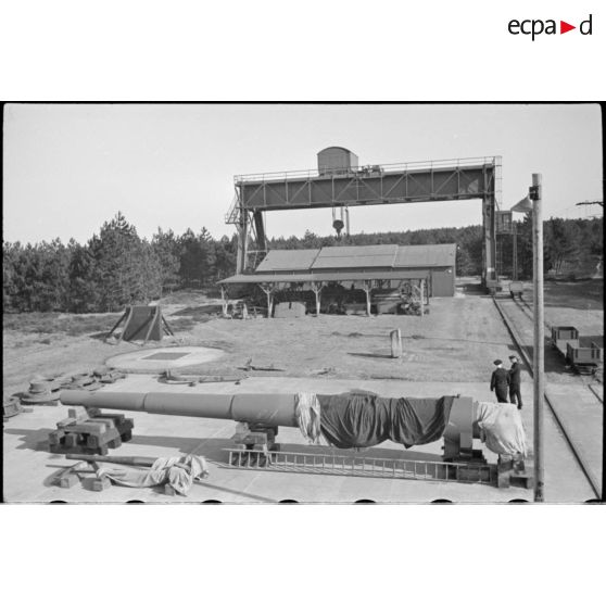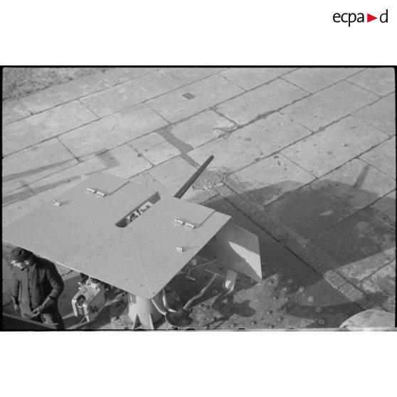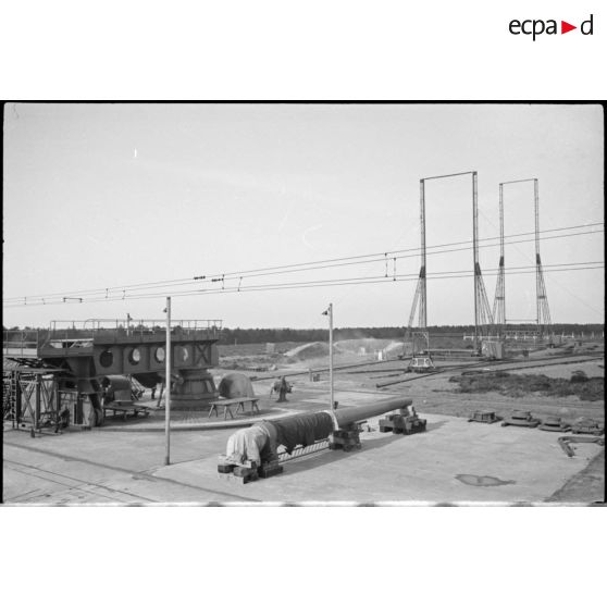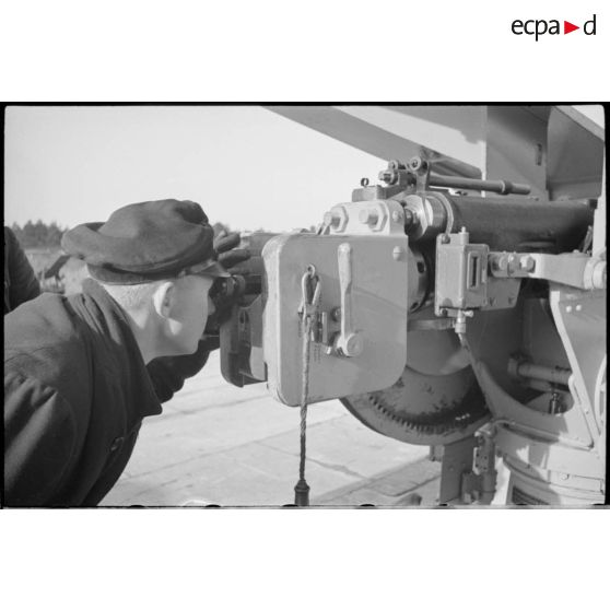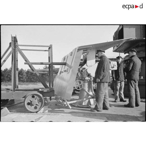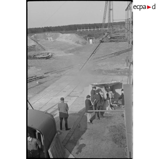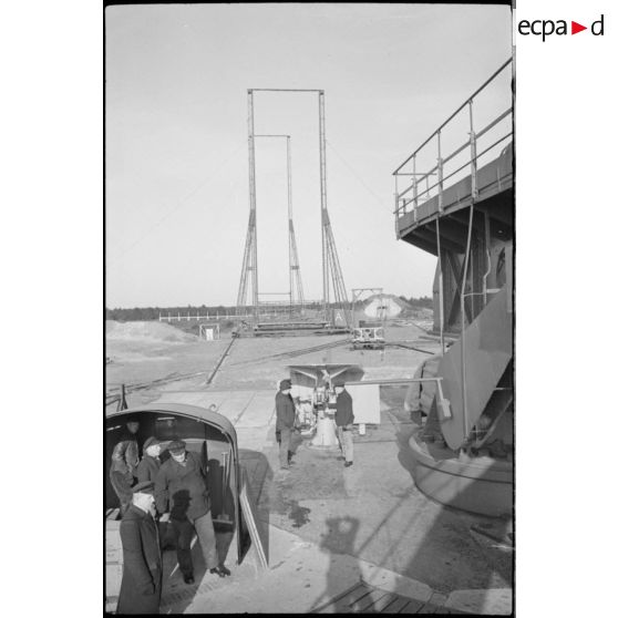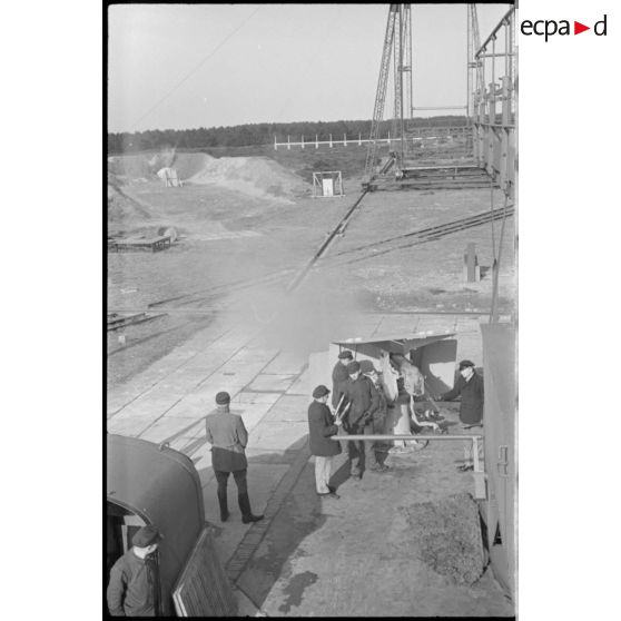 Tests d'une pièce d'artillerie dans un centre d' essais d'armement. Départ d'une section de transmissions.