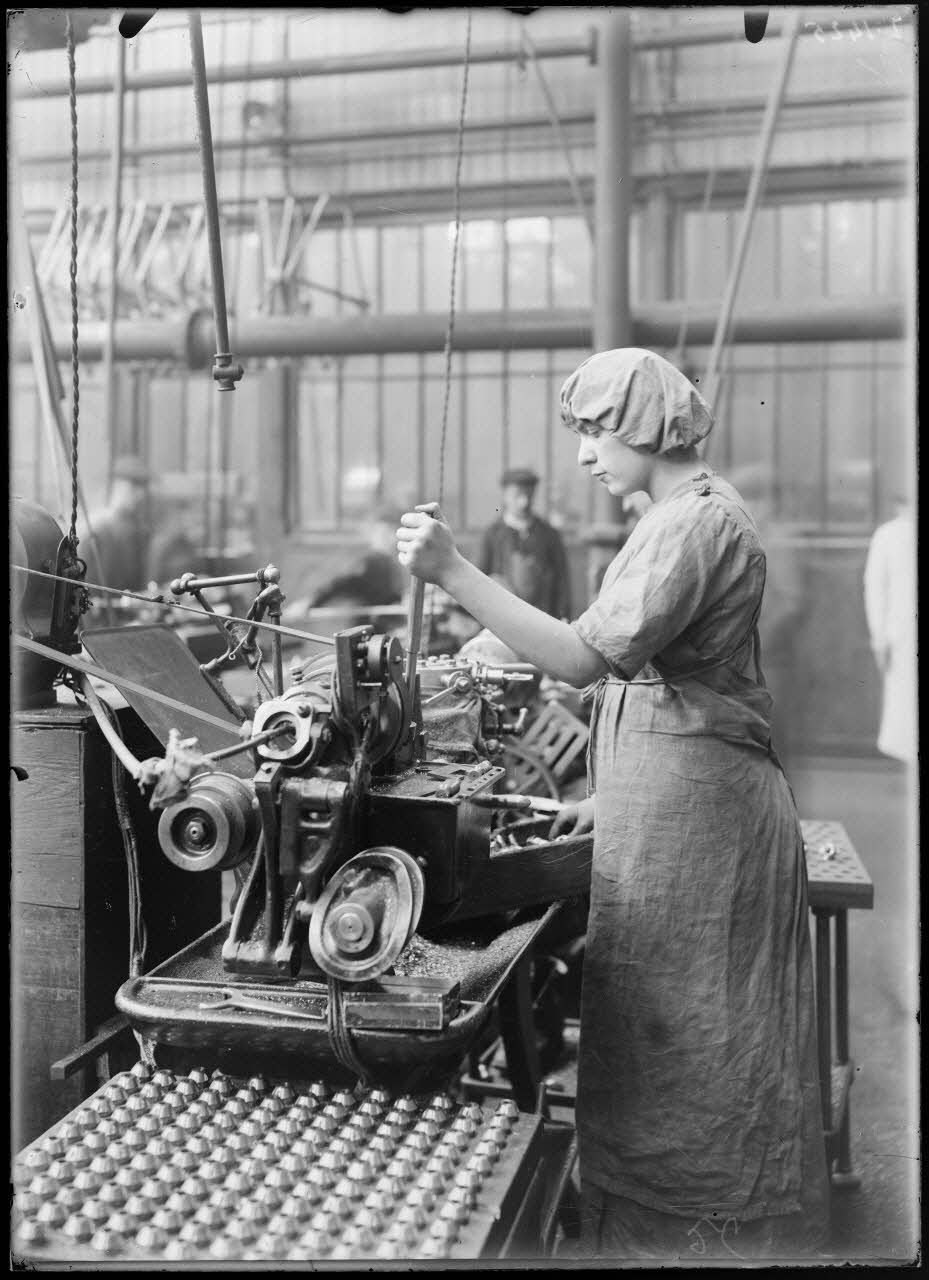 - Aux forges de la Chaliassière, (Saint-Etienne, janvier 1916, Z 1375 à Z 1388) les ouvriers et ouvrières préparent des bombes à ailettes (torpilles pour les mortiers de tranchées) ; des femmes équipées de lunettes de soudeur font de la soudure au chalumeau sur les ailettes des bombes.
