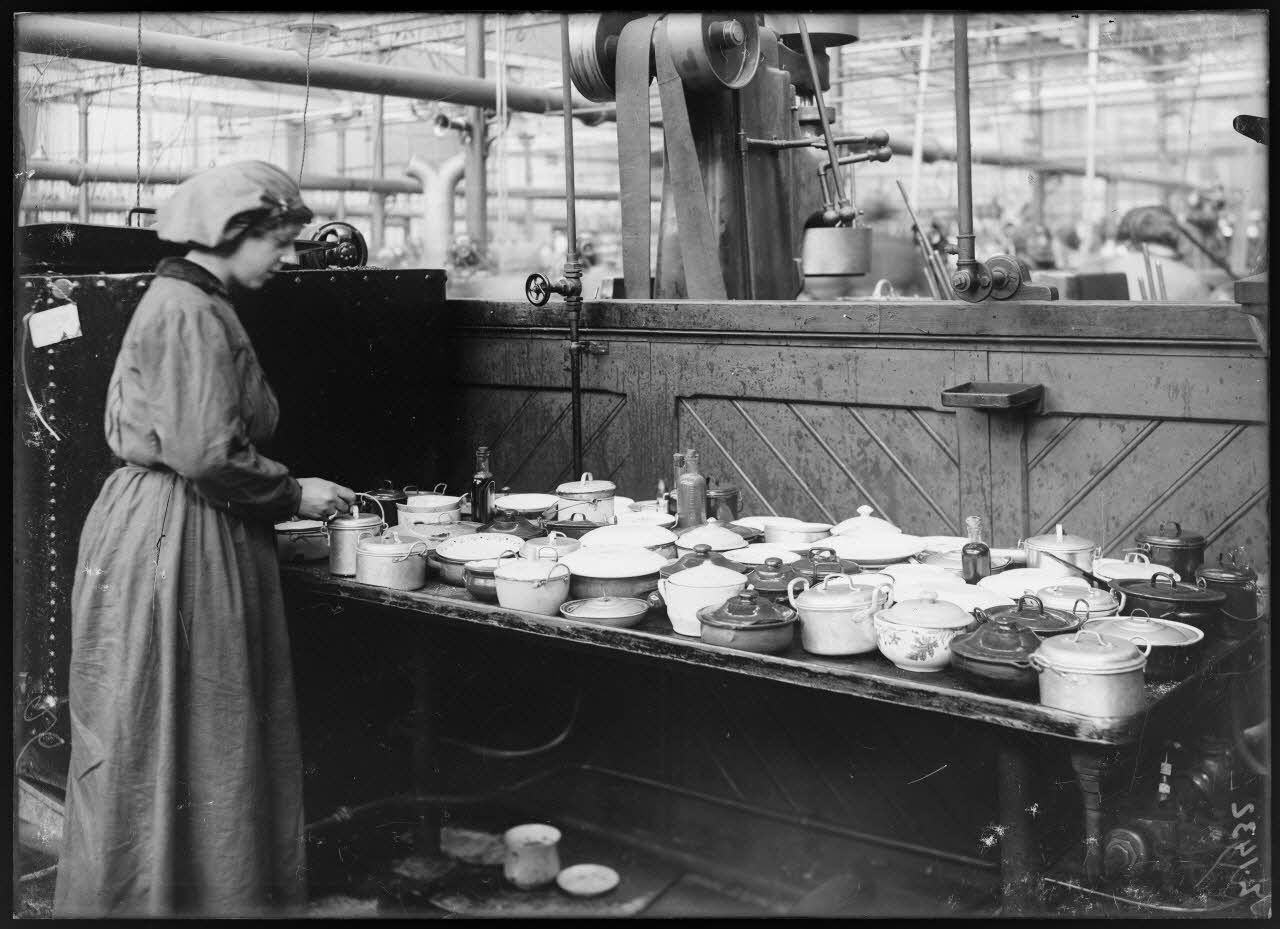 - Aux forges de la Chaliassière, (Saint-Etienne, janvier 1916, Z 1375 à Z 1388) les ouvriers et ouvrières préparent des bombes à ailettes (torpilles pour les mortiers de tranchées) ; des femmes équipées de lunettes de soudeur font de la soudure au chalumeau sur les ailettes des bombes.