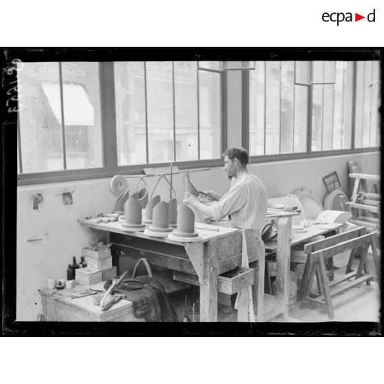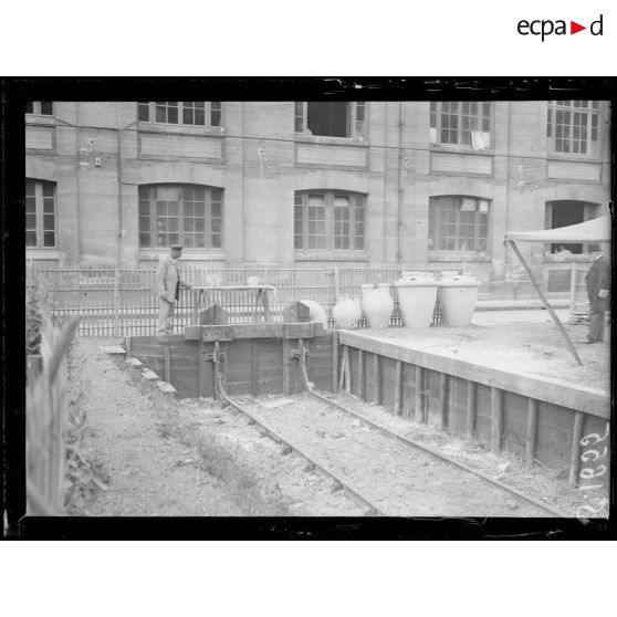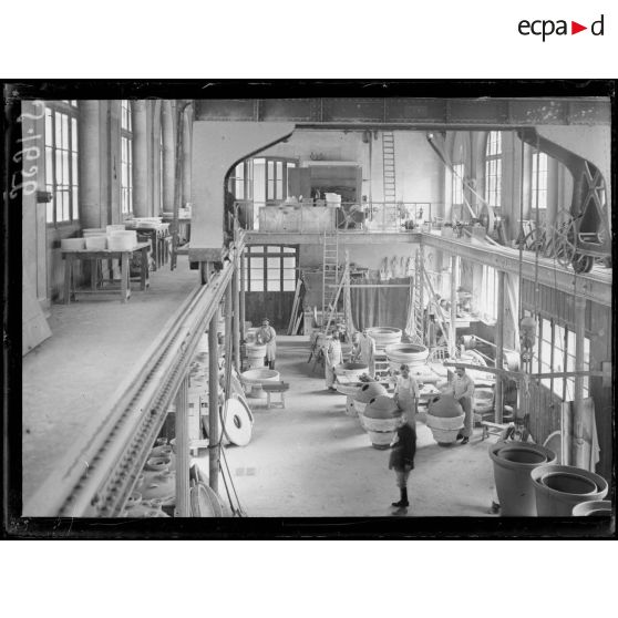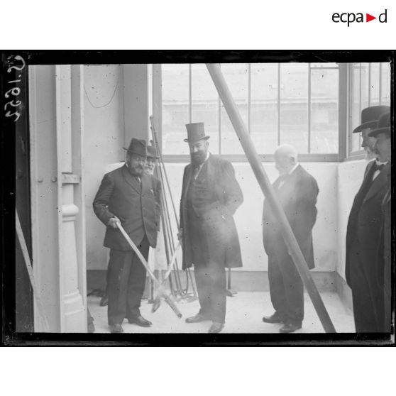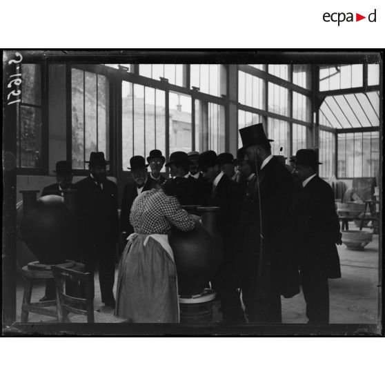 Visite de personnalités politiques dans un atelier de production de grès de la manufacture de Sèvres, juillet 1916.