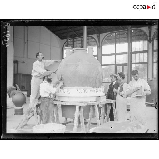 Albert Dalimier et Albert Thomas, accompagnés du député de Saône-et-Loire François Simyan, visitent les ateliers de production de grès de la manufacture de Sèvres. Avec des torches, ils allument le nouveau four. Un ouvrier tourne des tubulures. Les mélangeurs de 1200 litres s'actionnent dans l'atelier où les pâtes sont broyées. Des grès sortent du four.