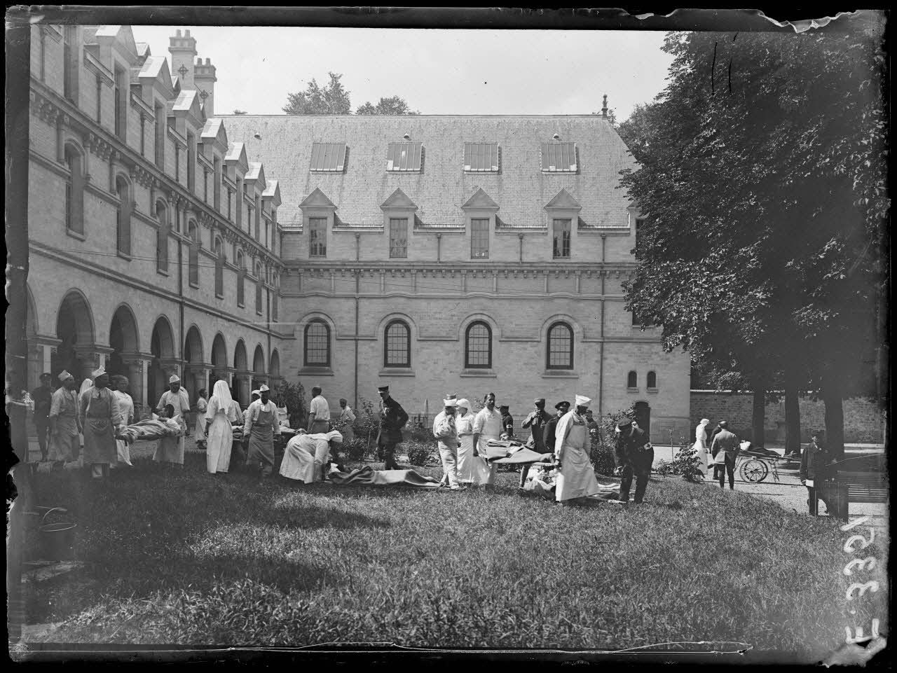Des soldats assistés d'infirmières se reposent dans un jardin, à l'intérieur de l'enceinte de l'hôpital auxiliaire n°6 Sainte Croix.