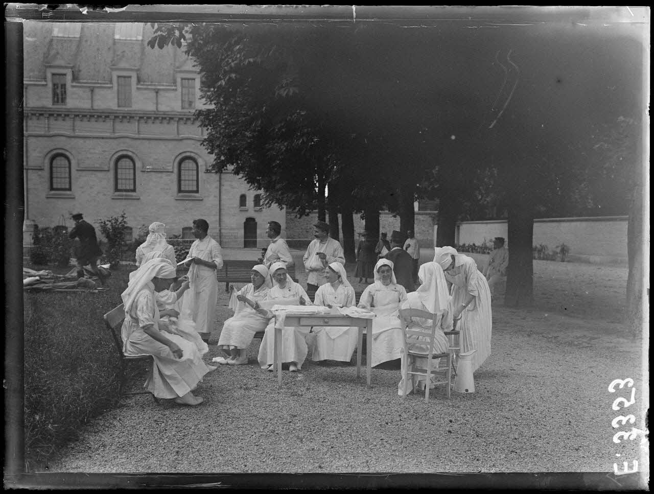 Des infirmières sont réunies autour d'une table, dans un jardin, à l'intérieur de l'enceinte de l'hôpital auxiliaire n°6 Sainte Croix.