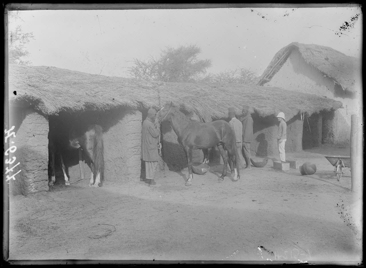 Un tirailleur tient un cheval par la bride devant les écuries du poste militaire de Maroua.
