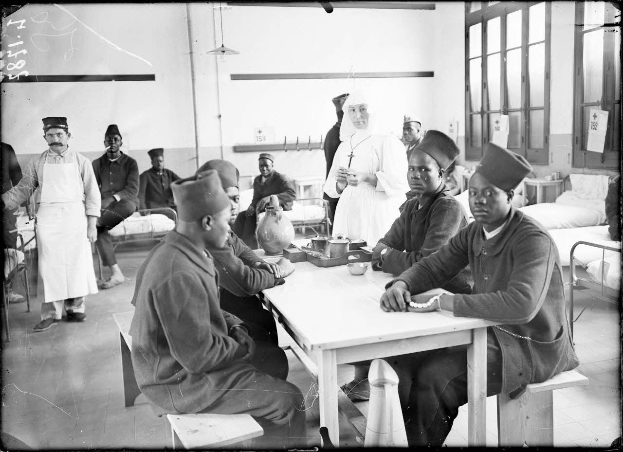 - les tirailleurs sénégalais blessés : en chambre, un tirailleur entouré du docteur Bonnafous et de deux religieuses, un groupe de tirailleurs convalescents, des tirailleurs en chambre jouant à l'awalé (à gauche) et aux dames (SPA 34 L 1794), le réfectoire, la cour de l'hôpital, le laboratoire, la salle des pansements ;