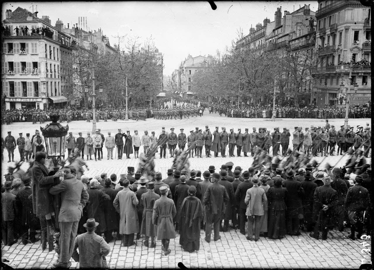 Marseille, place de la Préfecture, la foule après la revue. Les troupes prennent la rue Saint-Ferréol.