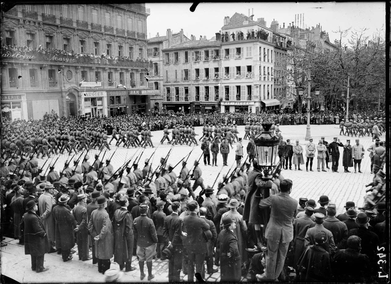 Marseille, place de la Préfecture, la foule après la revue. Les troupes prennent la rue Saint-Ferréol.