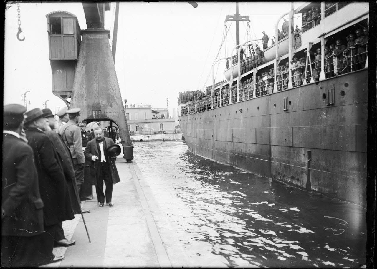 - l'arrivée du "Latouche-Treville" dans le port de Marseille, en présence du général Lokhvitsky (commandant de la 1re brigade) et de ses officiers d'Etat-Major ;