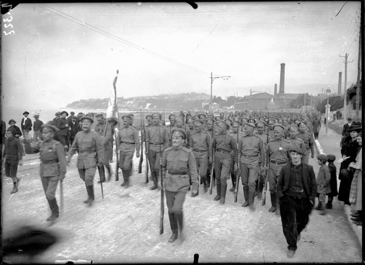 Marseille, les troupes russes partant pour la revue. [légende d'origine]