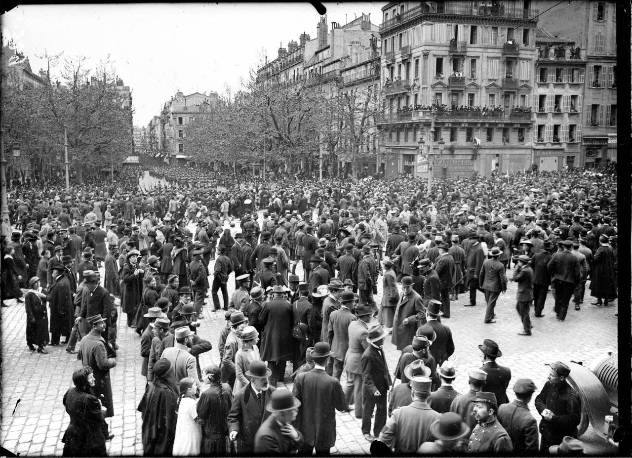Marseille, place de la Préfecture, la foule après la revue. Les troupes prennent la rue Saint-Ferréol. [légende d'origine]