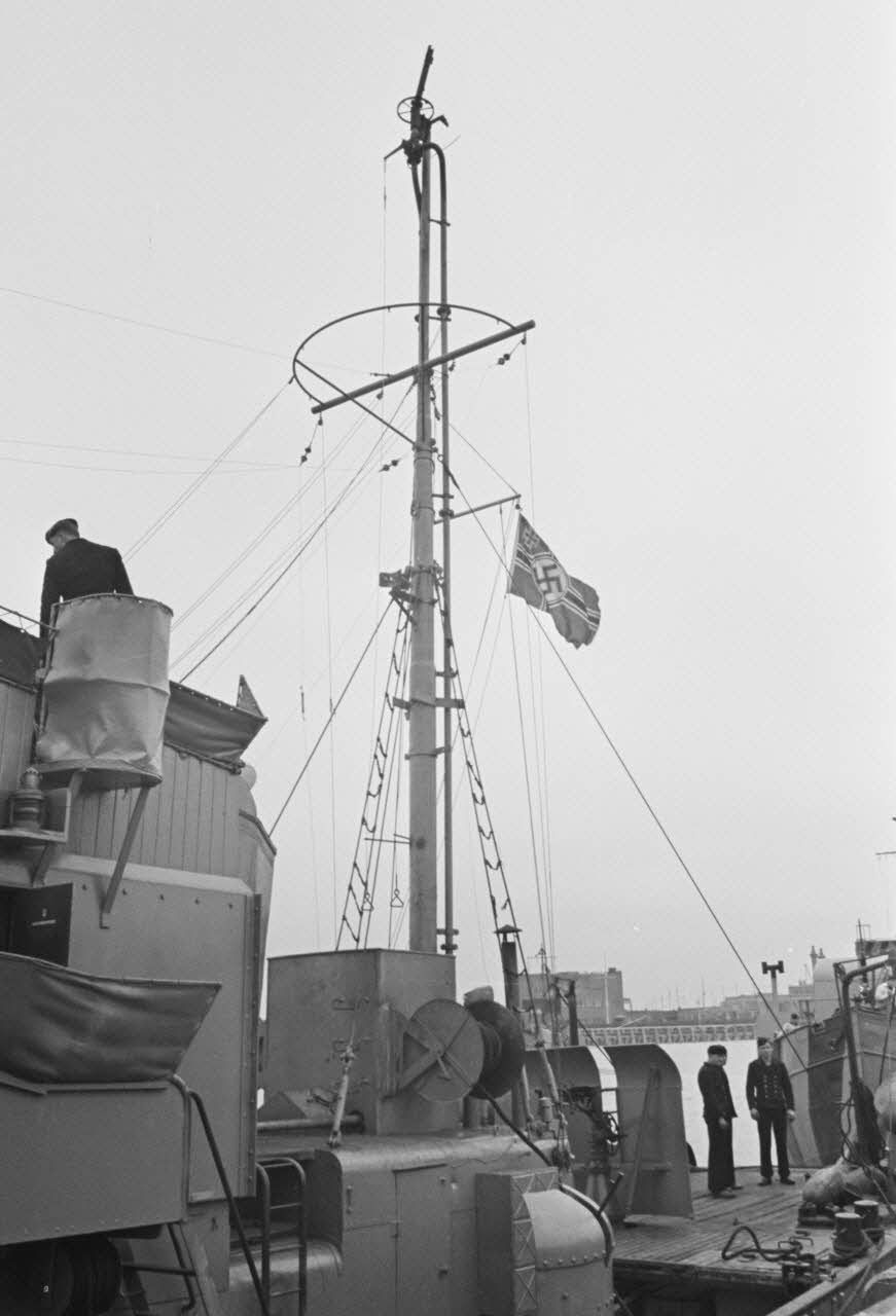Mat d'un dragueur de mines allemand (Sperrbrecher) transformé en navire lance-flammes ou bateau-pompe.