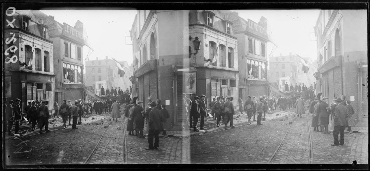 Maubeuge (Nord). Les habitants pavoisant et manifestant à l'occasion de l'Armistice.