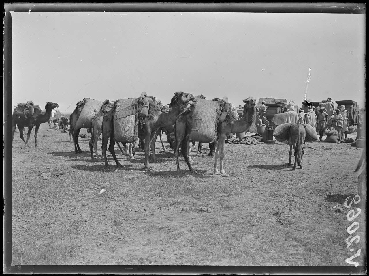 Mechra-Bel-Ksiri. Chameaux chargés de grains. [légende d'origine]