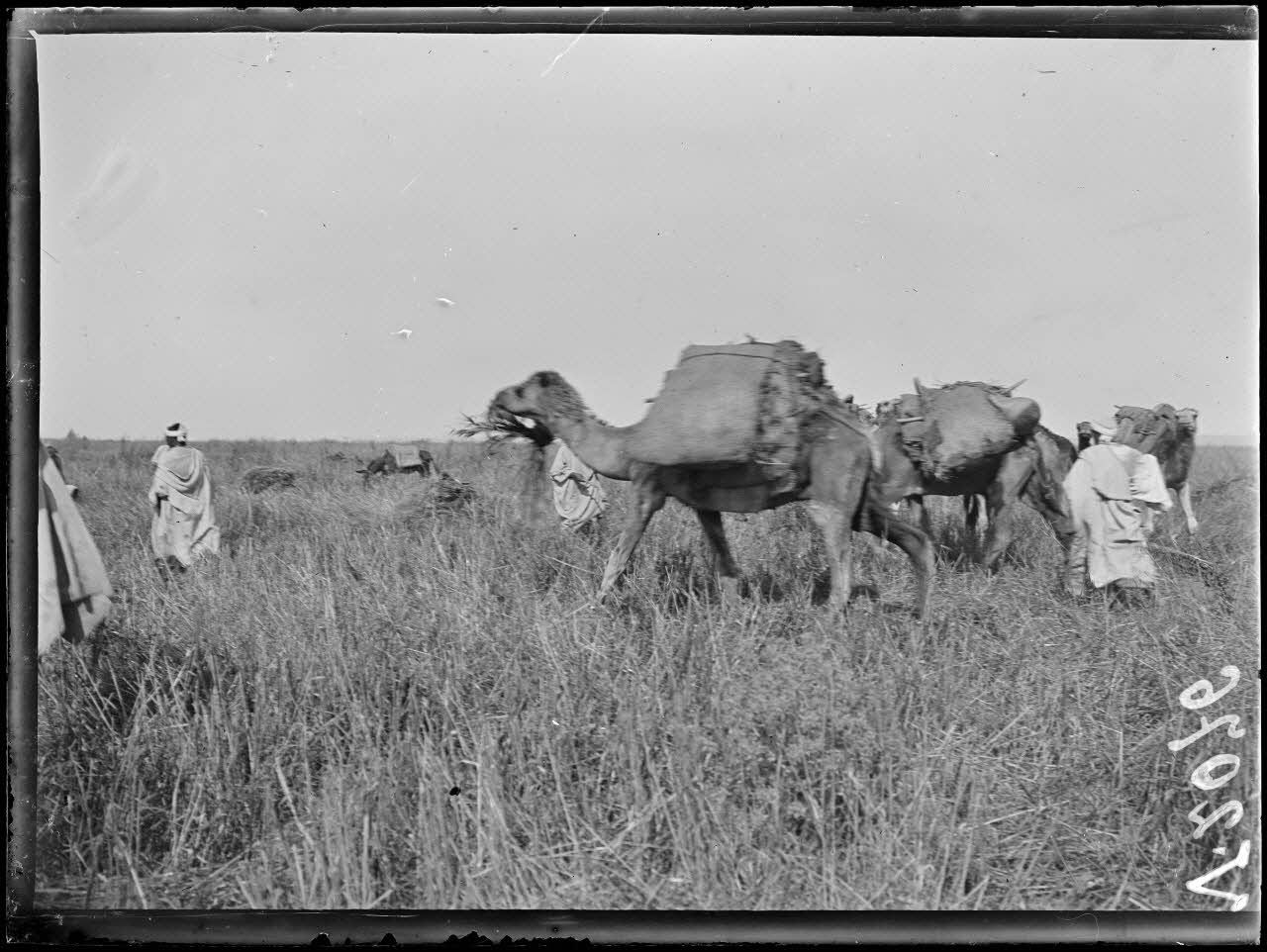 Mechra-Bel-Ksiri. Les chameaux chargés de blé partant pour le centre d'achat. [légende d'origine]