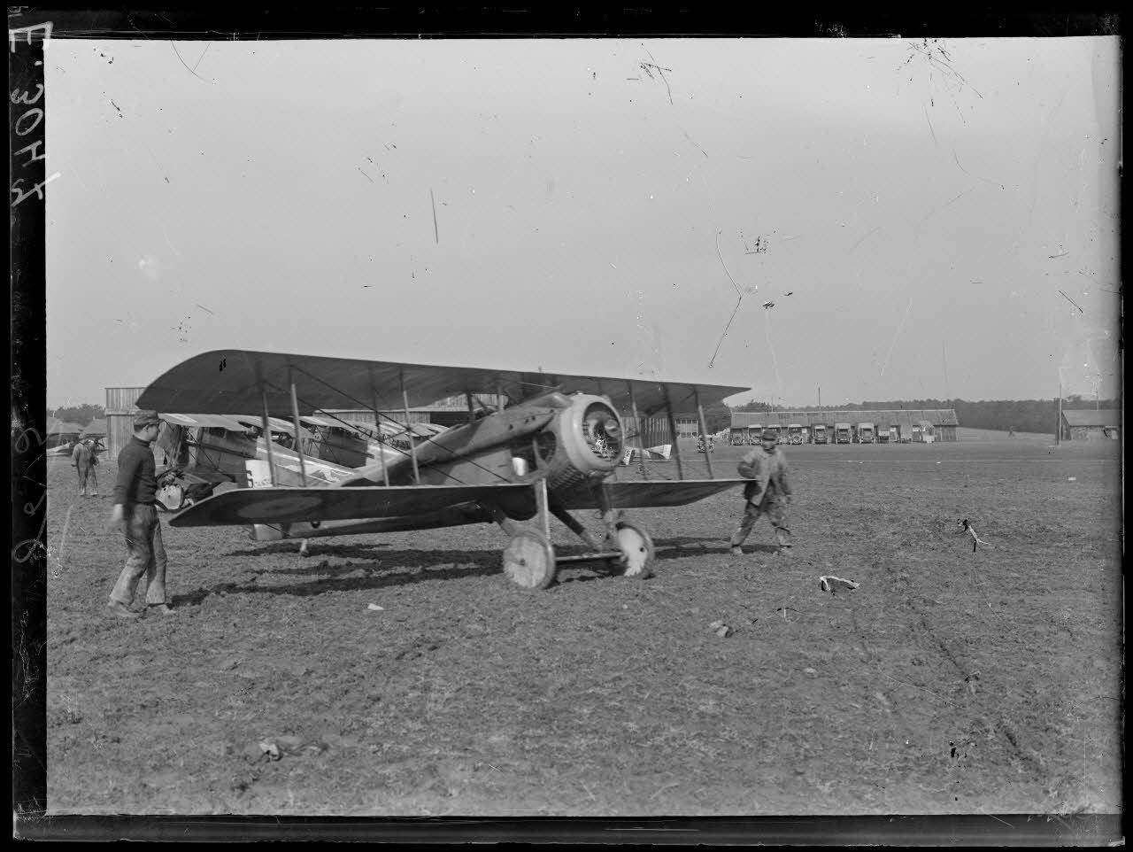 Villeneuve. Marne. Camp d'aviation. Le Lieutenant Hugues près de son appareil.