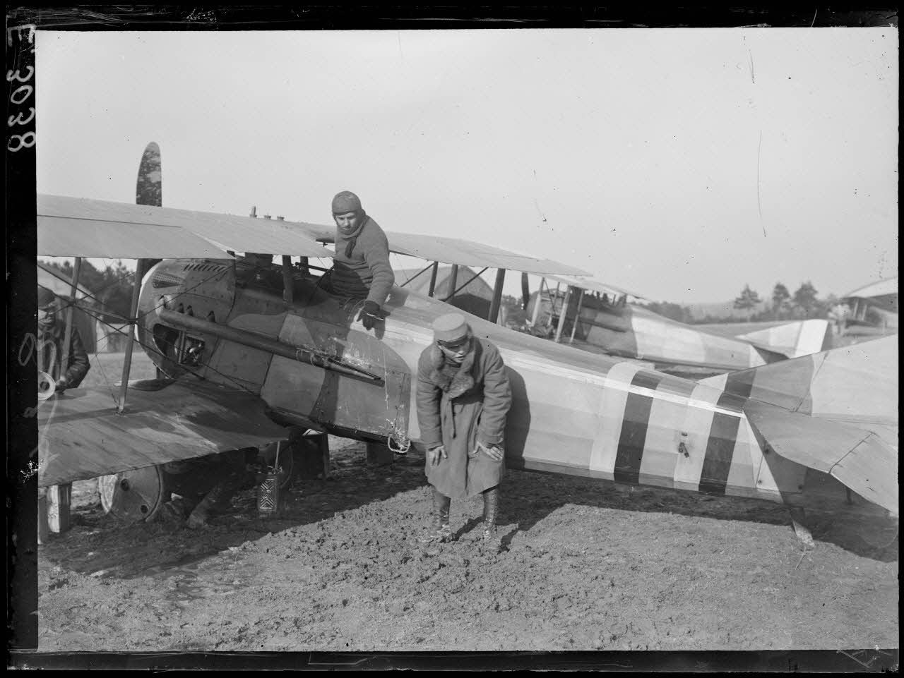 Melette. Marne. Camp d'aviation. L'adjudant Douchy près de son appareil.