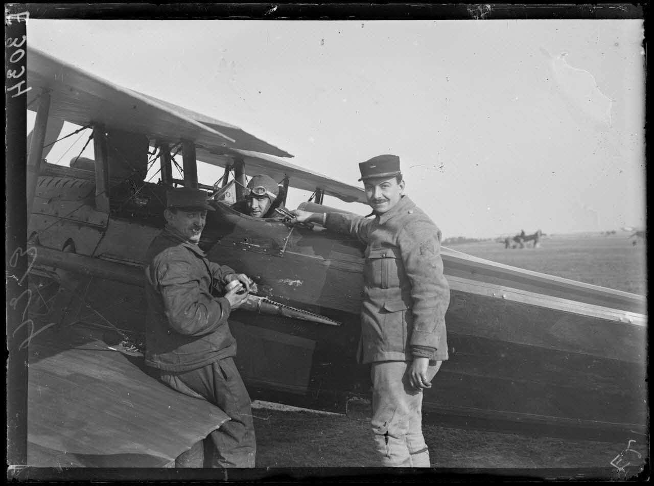 Villeneuve. Marne. Camp d'aviation. Le Lieutenant Hugues près de son appareil.