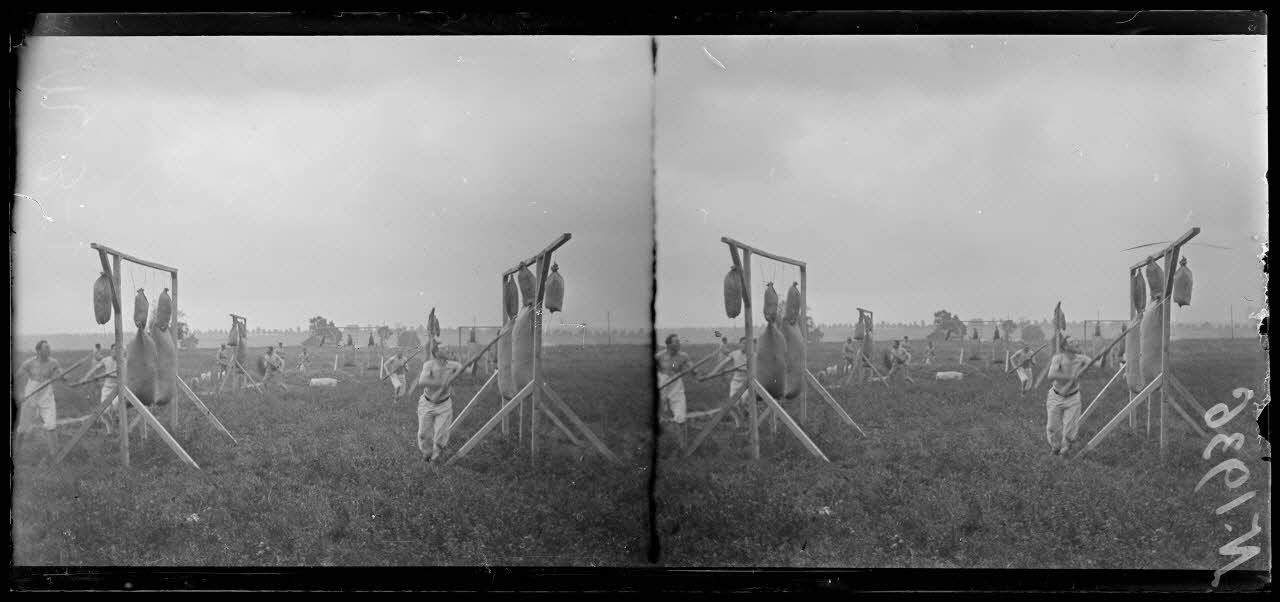 Melette (Marne). Centre d'entraînement des grenadiers d'élite. Exercices à la baïonnette, entraînement sur des tampons.