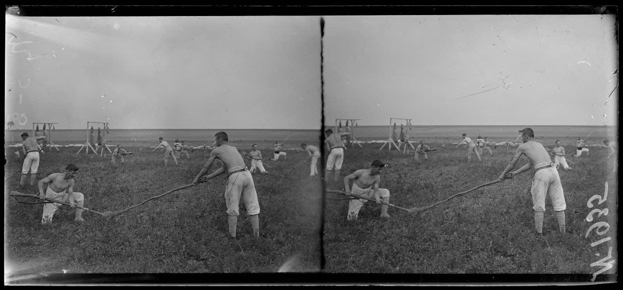 Melette (Marne). Centre d'entraînement des grenadiers d'élite. Exercices à la baïonnette, entraînement sur des mannequins.