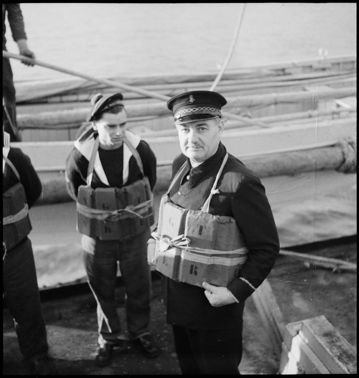 Membres d'équipage des marines nationale et marchande sur le pont, équipés de gilets de sauvetage, lors d'un exercice d'évacuation à bord du cargo réquisitionné Yang Tsé.