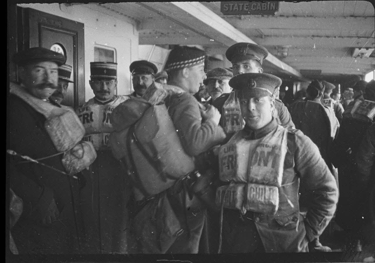 [Membres d'une commission française en compagnie de soldats de la marine britannique sur un navire, s.d.]