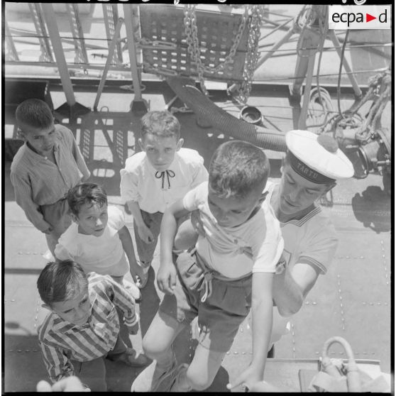 Mers el-Kébir. A bord de l'escorteur d'escadre Tartu, un marin du navire avec des enfants.