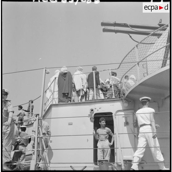 Mers el-Kébir. La population civile sur le pont de l'escorteur d'escadre (E.E) Duperré.
