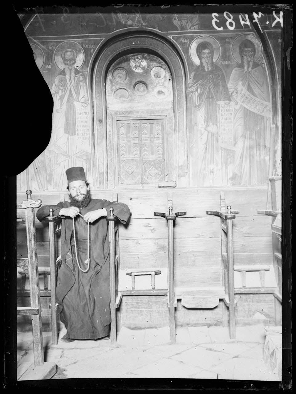 Météores (Thessalie). Couvent de Saint Barlaam. Intérieur de l'église, stalles et peintures. [légende d'origine]