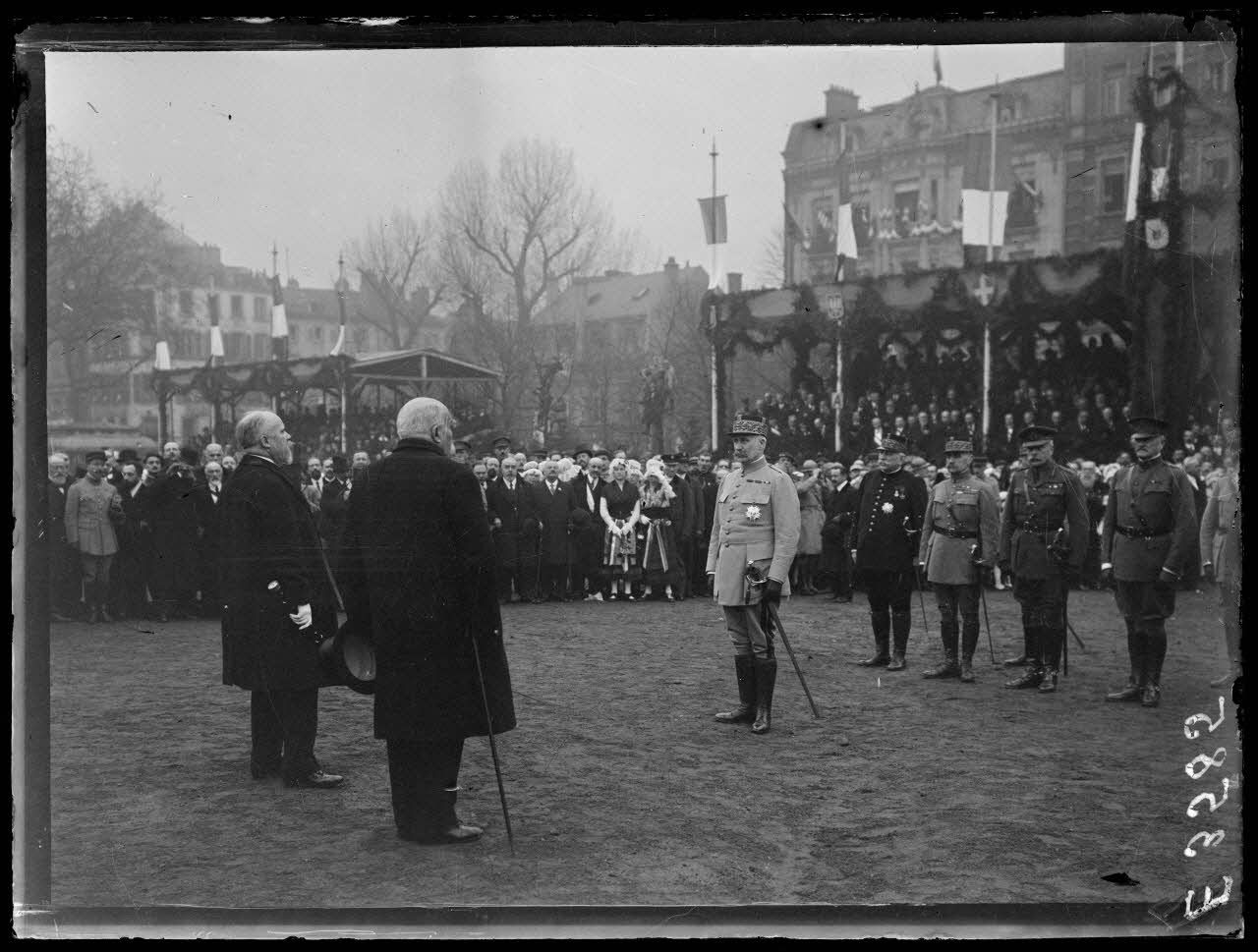 Metz. Voyage de M. Poincaré. Discours du Président au maréchal Pétain avant de remettre à celui-ci ses insignes de maréchalat. [légende d'origine]