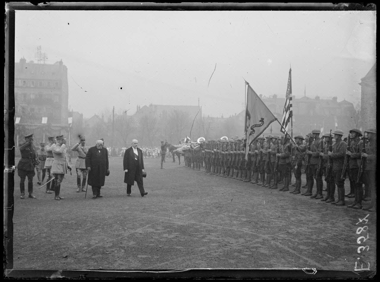 Metz. Voyage de M. Poincaré. Le Président et M. Clemenceau passent devant le drapeau américain. [légende d'origine]