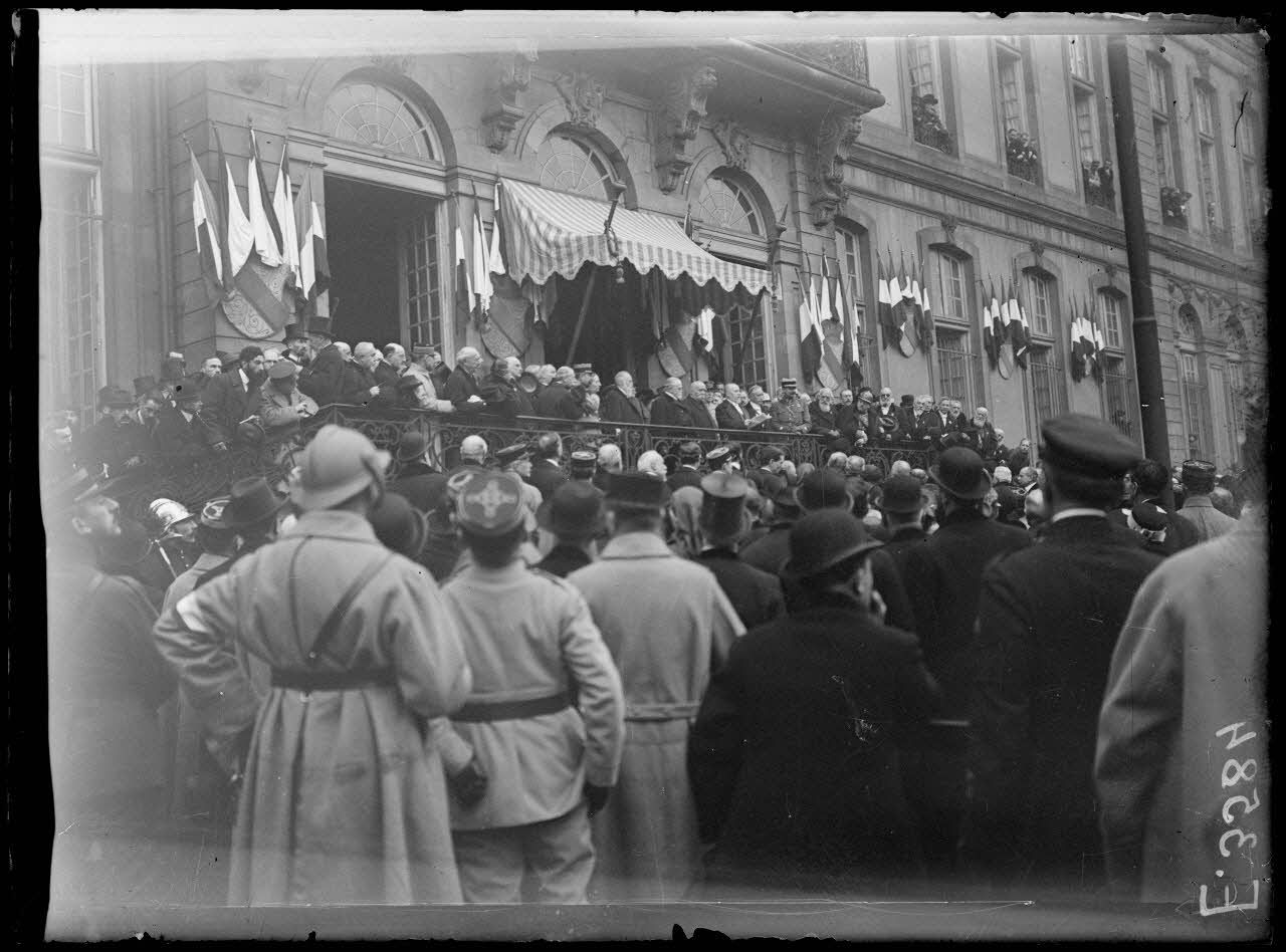 Strasbourg. Voyage de Mr Poincaré. Le Président, quittant l'hôtel de ville, salue la foule.