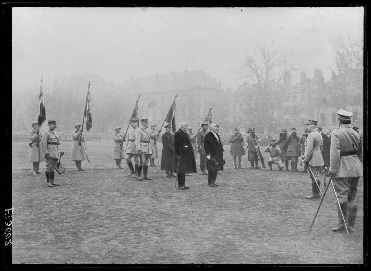 Metz. Voyage de M. Poincaré. Le Président et M. Clemenceau passent devant le drapeau américain.