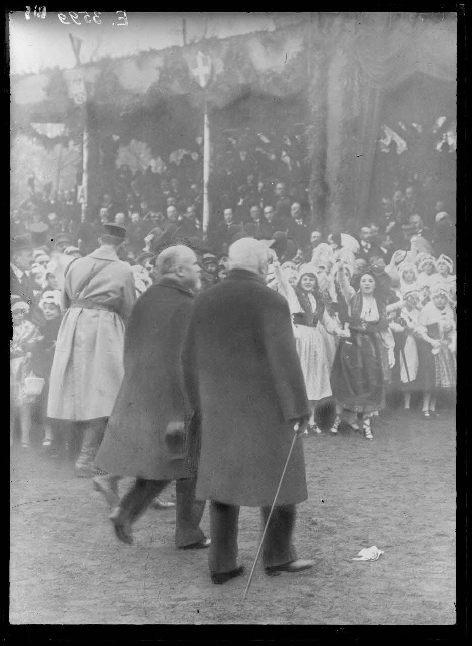 Metz. Voyage de Mr Poincaré. Le Président et Mr Clemenceau montent à la tribune officielle. [légende d'origine]