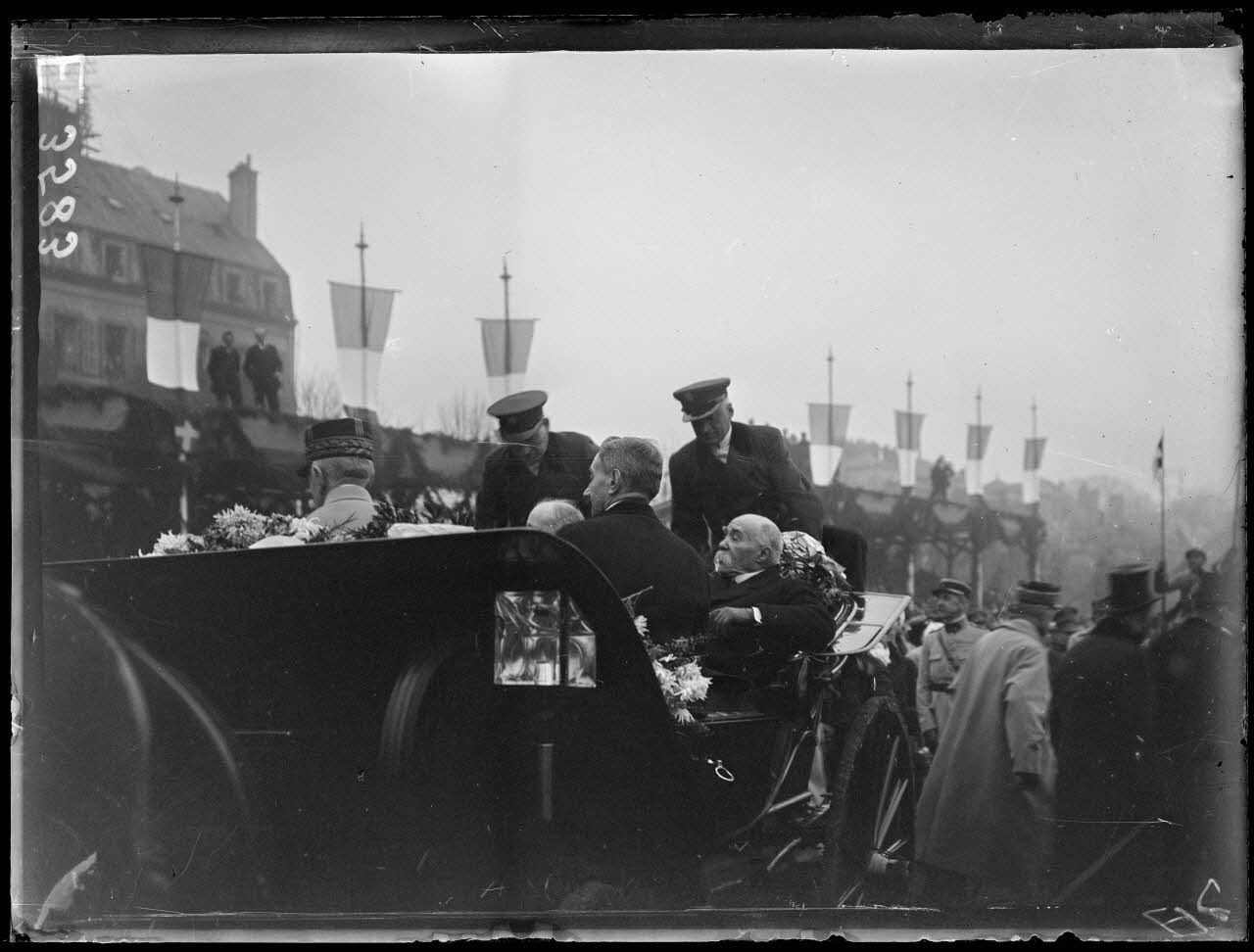 [Metz. Voyage de Mr Poincaré. MM Clemenceau et Poincaré arrivent en calèche sur la place d'armes.]