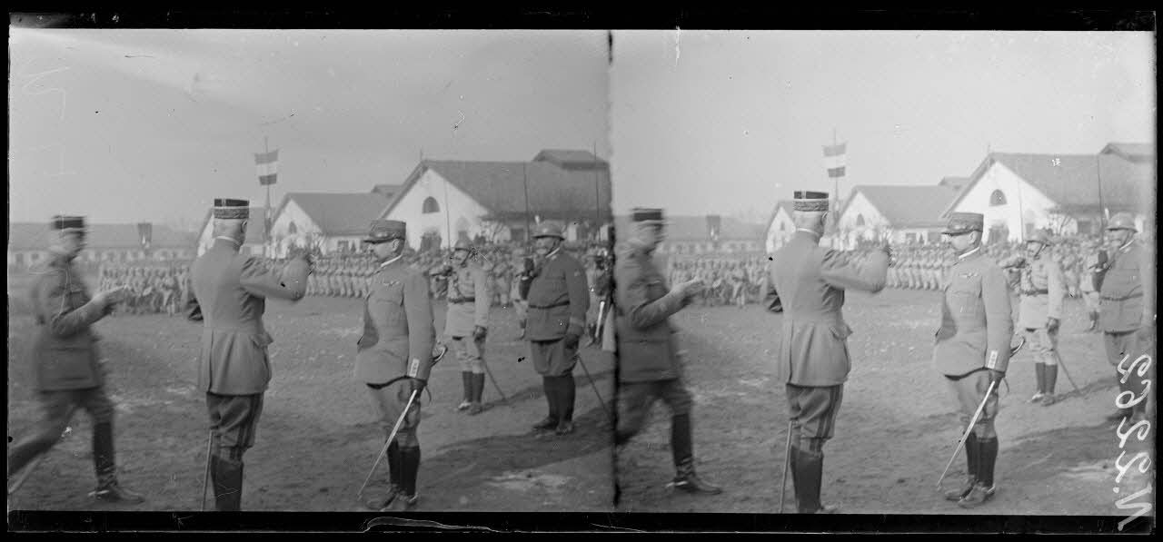 Milan. Quartier de cavalerie Montebello. Revue du 105e territorial par le général Fayolle. Le général Fayolle décore des officiers du 105e (5-2-18).