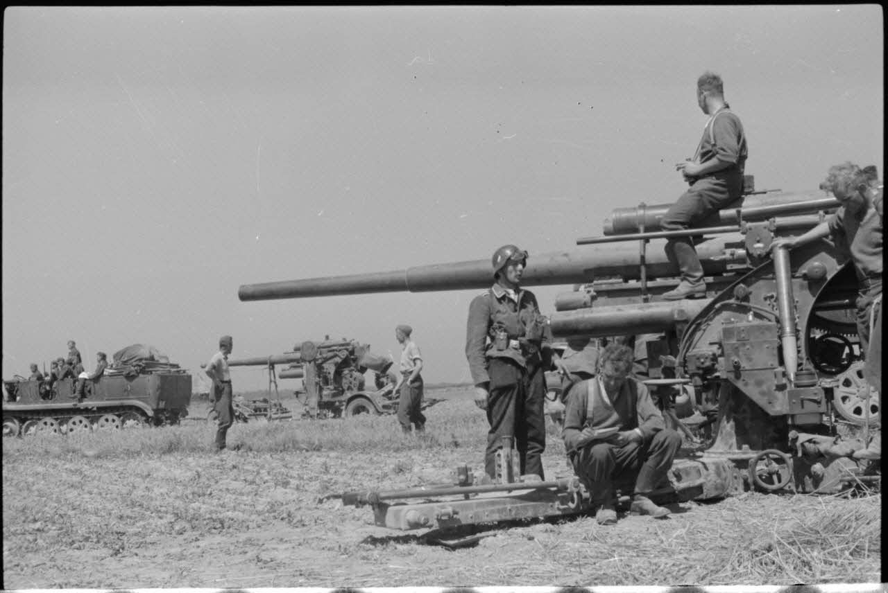 Sur les hauteurs d'Eu, une batterie de DCA armée de canons de 8,8 cm Flak 18 L/56 et les tracteurs d'artillerie Sd.kfz.9. Un sous-officier infirmier comme le précise sa patte d'épaule quitte cette table (DAA 573 L09).