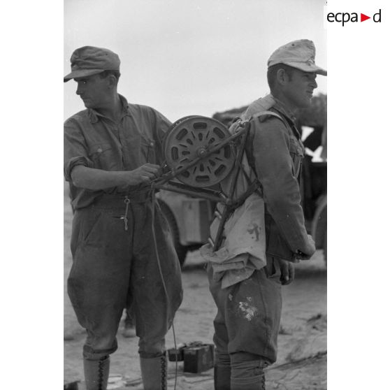 Mise en place d'une position défensive dans le désert et de lignes téléphoniques pour la communication.
