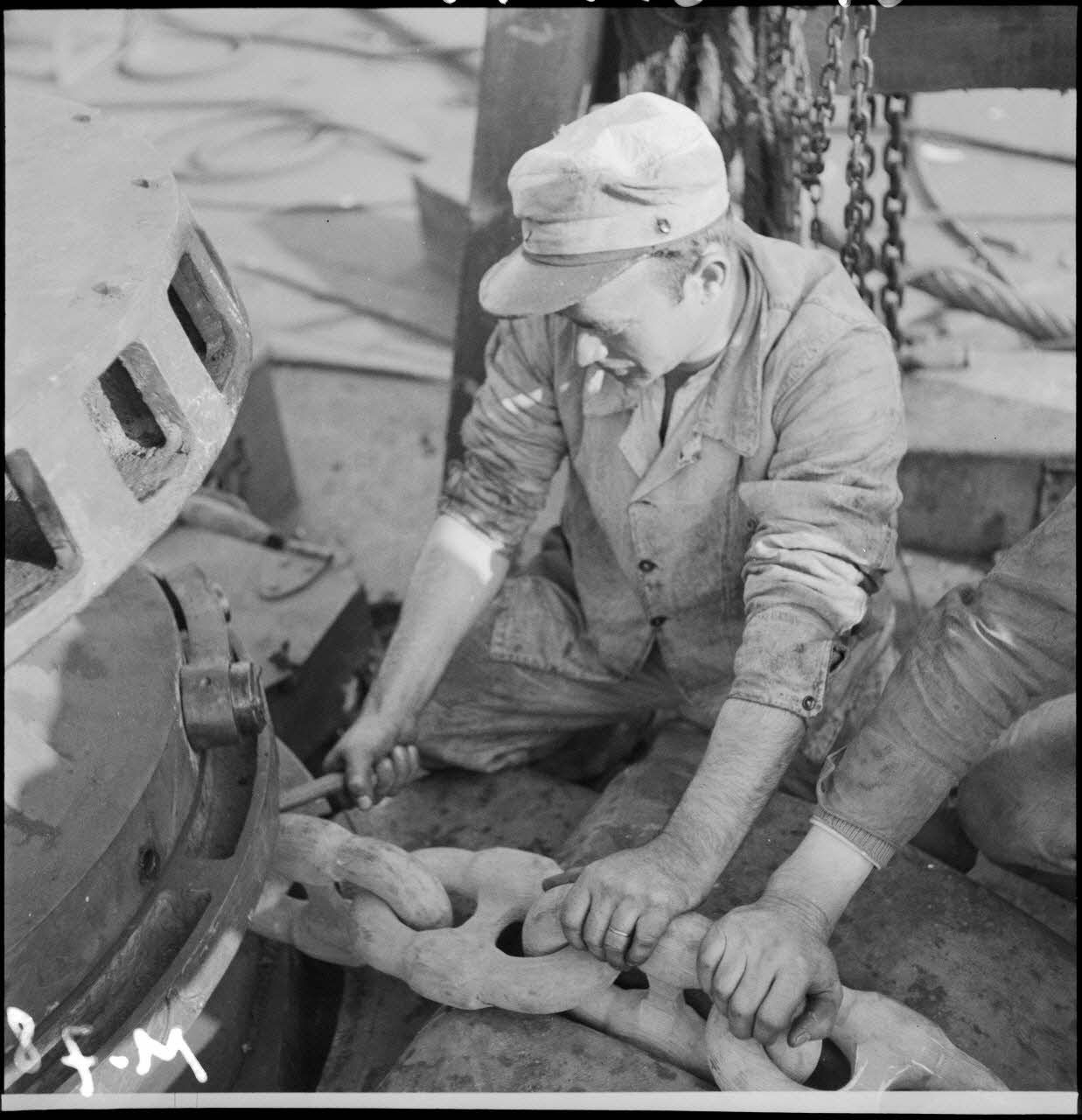 Mise en place de l'une des chaînes d'ancrage sur le chantier de construction du croiseur Richelieu à l'arsenal de Brest.
